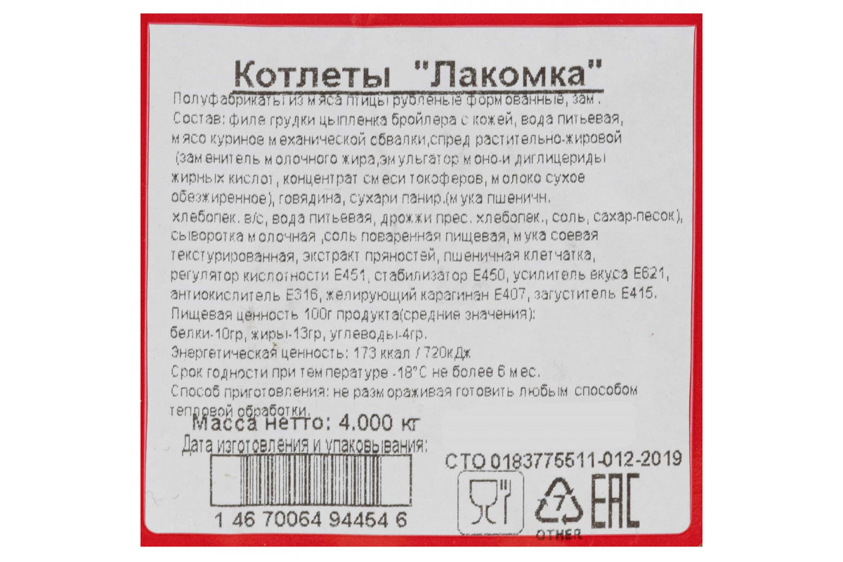 Состав: мясо птицы, масло сливочное, сухари панировочные, соль поваренная пищевая, специи